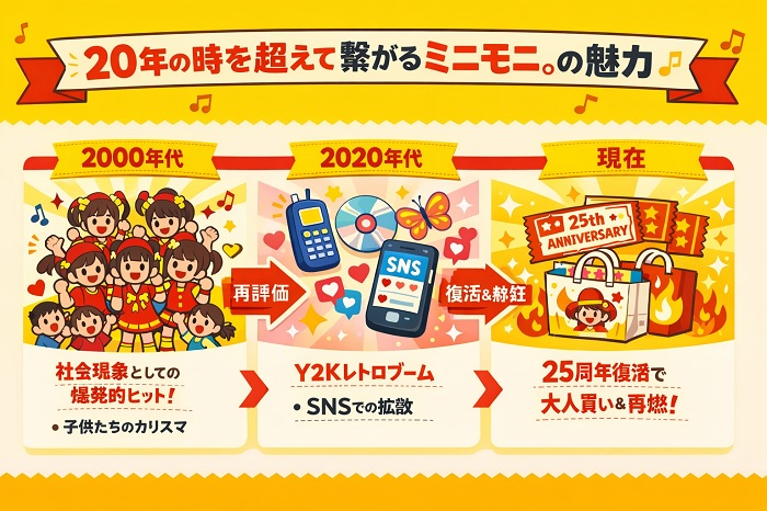 ミニモニ。が持っていたポップでカラフルなビジュアル、そして「身長150cm以下」という個性を武器に変えたポジティブな姿勢が、当時のファンだけでなく、Z世代からも「新しくて可愛いアイコン」として支持されているのです。