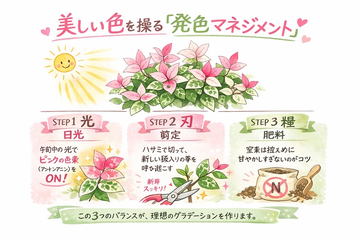 ハツユキカズラの色を自在に操るためには、植物生理に基づいた3つの要素をコントロールする必要があります。