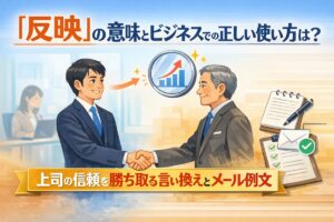 「上司から指示された修正を終えたけれど、報告メールで『反映しました』と書いて失礼にならないだろうか?」 入社2年目の社会人のように、言葉一つで自分の評価が決まってしまうビジネスの現場では、こうした小さな不安が尽きないものです。 結論から申し上げますと、上司への報告には「反映いたしました」という謙譲表現を使うのが正解です。 しかし、単に言葉を丁寧にすれば良いわけではありません。 実は「反映」という言 … 続きを読む 「反映」の意味とビジネスでの正しい使い方は?上司の信頼を勝ち取る言い換えとメール例文