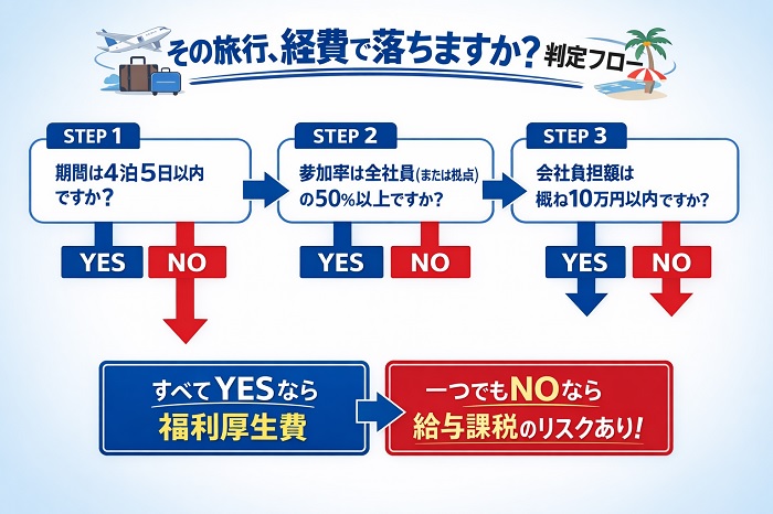 - 所得税基本通達36-30の3条件(4泊5日、50%参加、10万円)を死守する。