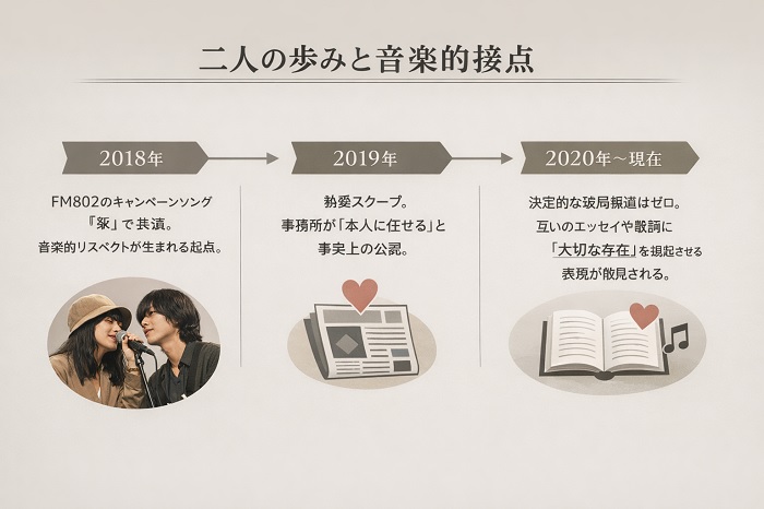 楽曲「栞」での共演という音楽的リスペクトから始まった二人の関係は、今や単なる「恋人」という枠を超え、互いの創作活動を支え合う「魂のパートナー」へと昇華しているのではないでしょうか。