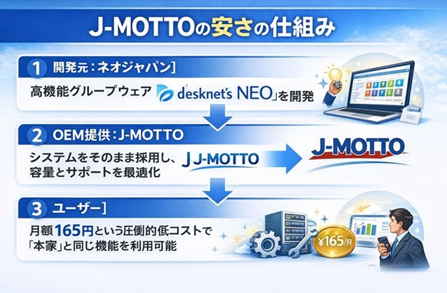 まず理解すべきは、J-MOTTOとdesknet’s NEOは「OEM(相手先ブランドによる生産)」という関係にあるということです。
