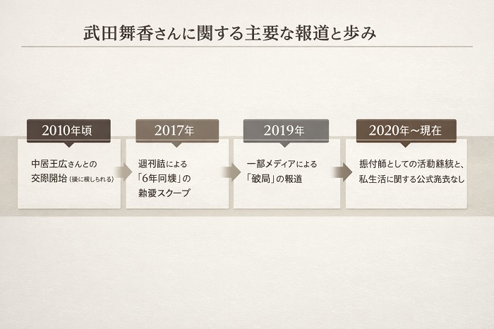 武田舞香さんと中居正広さんの関係については、2019年に「約10年にわたる関係にピリオドを打った」という破局報道が出て以降、二人の密会や復縁を示唆する決定的な証拠は一度も報じられていません。