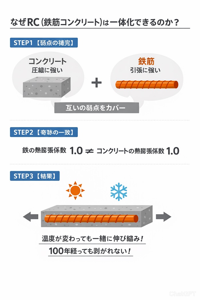 さらに驚くべき事実は、全く異なる物質である鉄筋とコンクリートの「熱膨張係数(温度変化による伸び縮みの割合)」が、一定の数値でほぼ一致している点です。