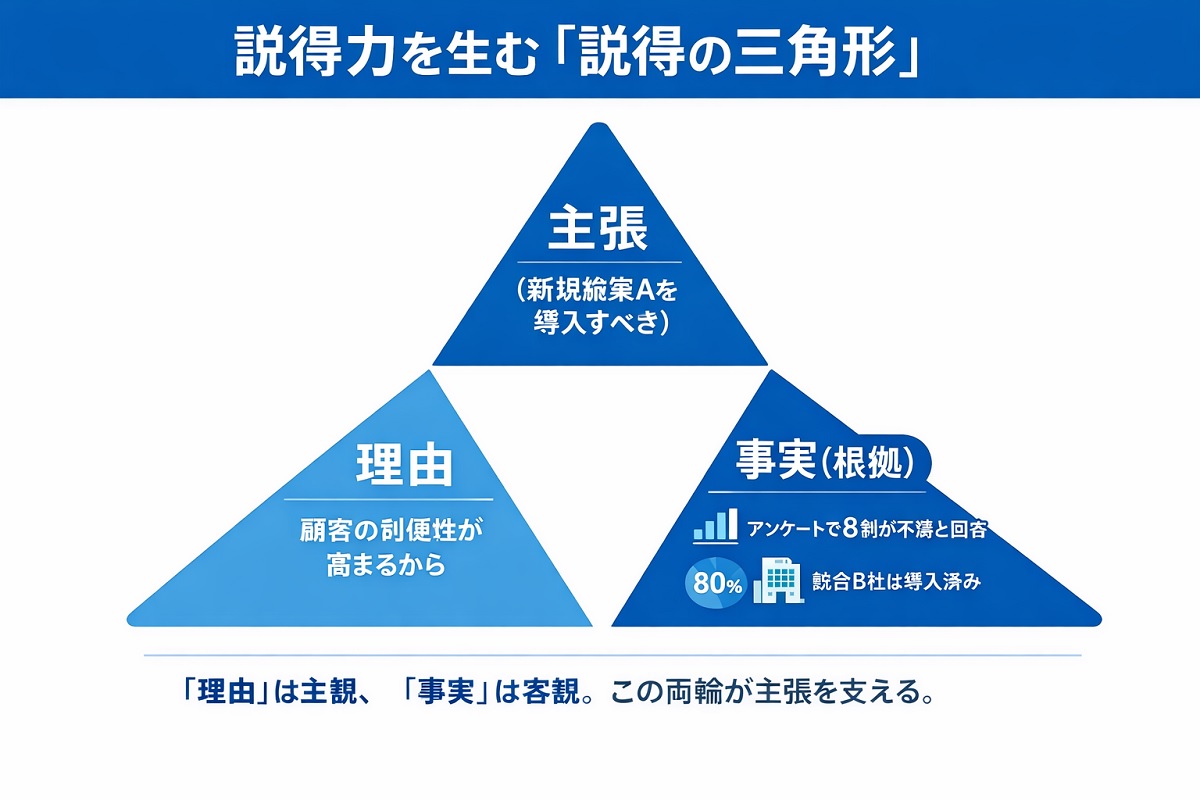説得の三角形とは、「主張(結論)」「理由(ロジック)」「事実(根拠)」の3つがセットになって初めて、相手は納得するという論理構造のことです。
