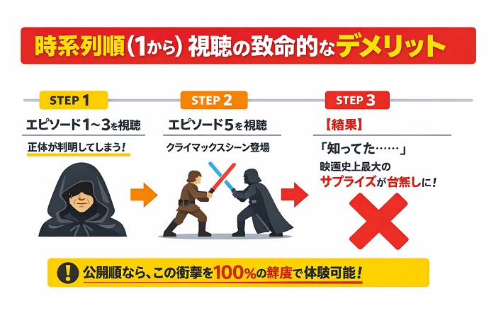 そのため、物語の時系列順(1から)見てしまうと、本来エピソード5で明かされるべき「映画史上最大の衝撃」が、エピソード3の時点で完全にネタバレされてしまうのです。