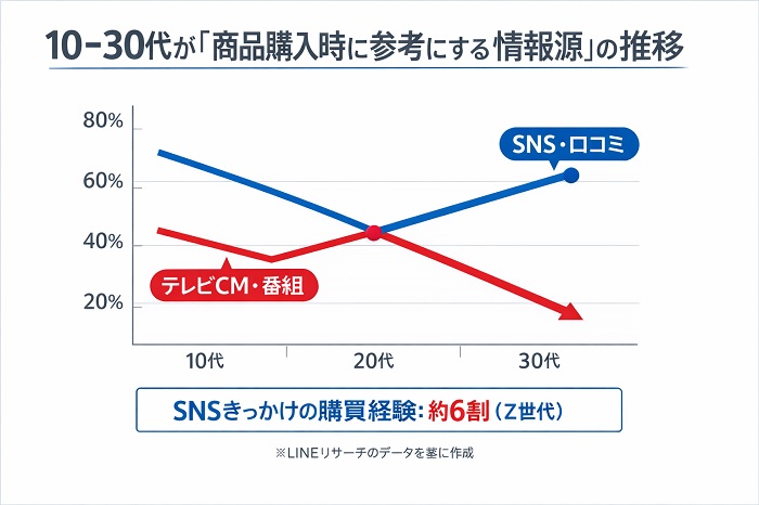 特に10代から30代の若年層において、情報収集の主役はテレビからSNSへと完全に移行しました。