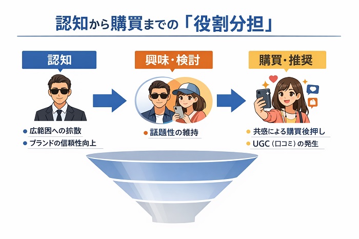 戦略的なハイブリッド活用とは、有名人で「知っている状態」を作り、インフルエンサーで「欲しい状態」へ引き上げる設計を指します。