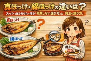 [著者情報] 執筆:おさかな大将・マサ 元・豊洲市場仲卸 / 家庭料理研究家 20年間で10万匹以上の魚を扱ってきた目利きのプロ。現在は「魚嫌いな子供が完食するレシピ」をSNSで発信中。忙しいお母さんの味方として、プロの裏技を日本一わかりやすく伝えます。 スーパーの鮮魚コーナーで、特売の「縞(しま)ほっけ」と、少しお高めの「真(ま)ほっけ」のパックを交互に見ては、「結局どっちがいいの?」と立ち往生 … 続きを読む 真ほっけ・縞ほっけの違いは?スーパーで迷うあなたへ贈る「失敗しない選び方」と魔法の焼き方