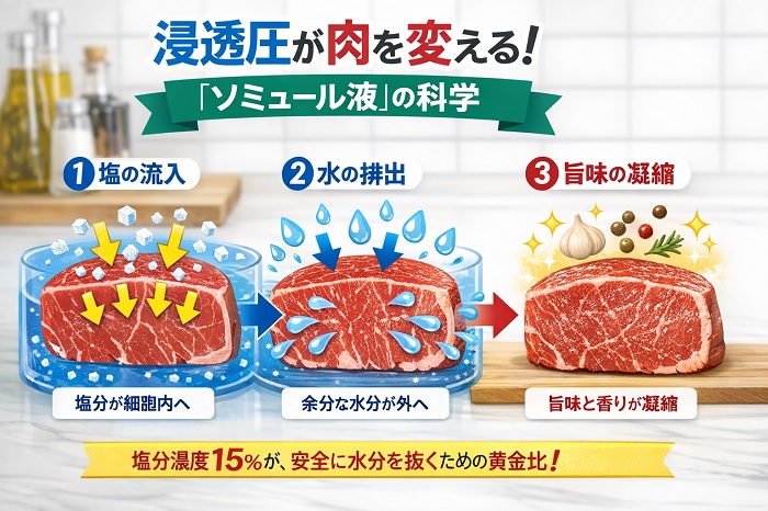 ソミュール液と肉の間で起こる「浸透圧」のプロセスとは、濃度の高い塩水(ソミュール液)が肉の内部に入り込もうとする力のことです。