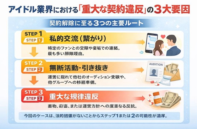 アイドル業界における「重大な契約違反」には、大きく分けて3つのルートが存在します。