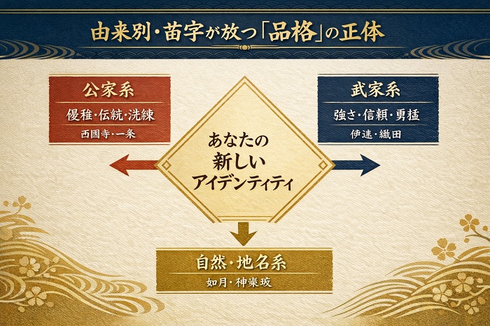 これらの苗字は、「公家由来」というエンティティが「優雅・伝統」という属性と強く結びついており、名乗るだけで洗練された知的な印象を与えます。