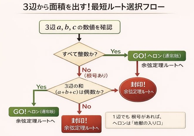 結論から言うと、ヘロンの公式は「3辺が整数のとき」にだけ許された最強のショートカット武器です。