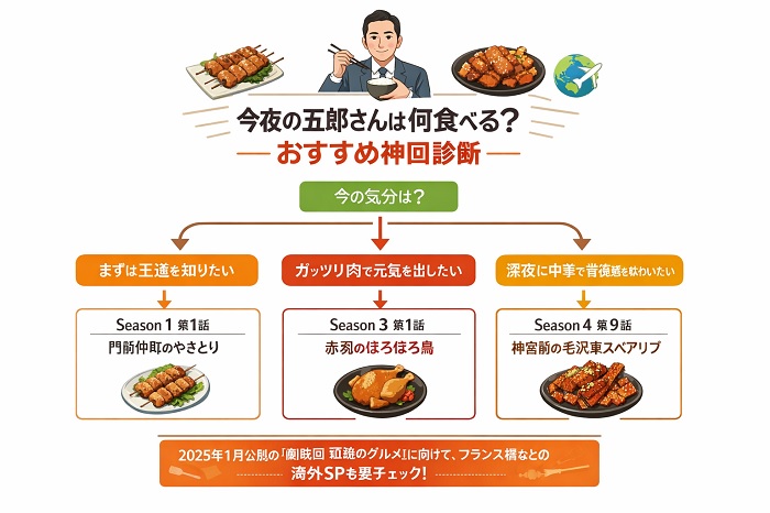 本記事では、忙しいあなたが今夜最高の「飯テロ体験」に没入できるよう、最新の配信状況と、初心者でも絶対に外さないおすすめエピソードを厳選して紹介します。