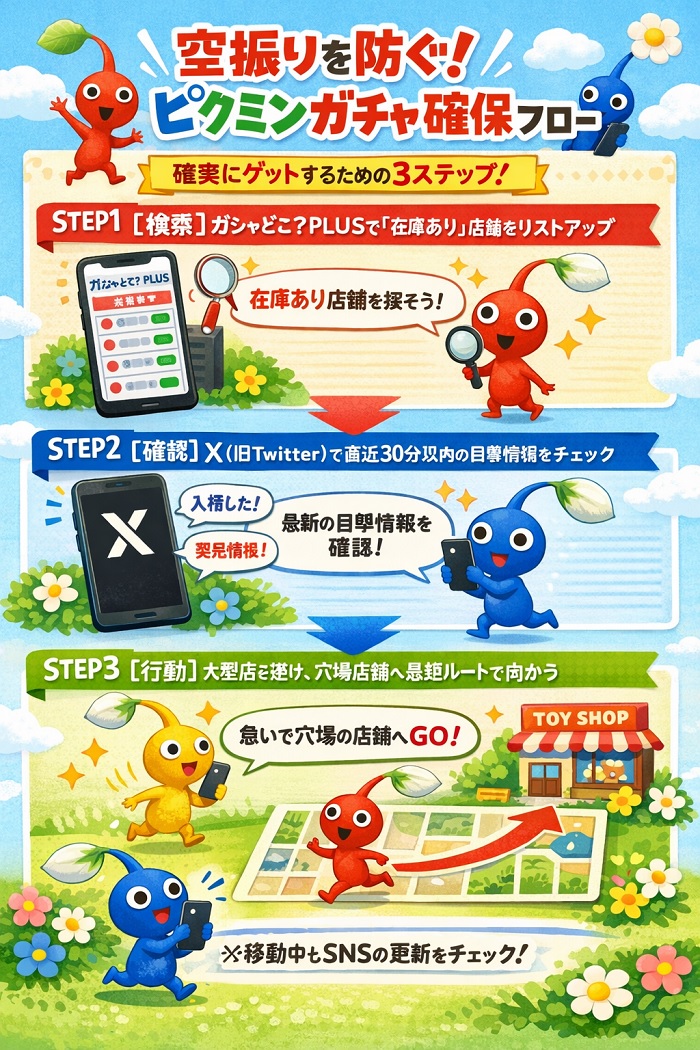ピクミンガチャの設置場所探しで最も大切なのは、「公式の在庫データ」に「SNSのリアルタイム性」を掛け合わせ、ライバルの少ない「穴場」へ向かう戦略です。