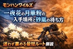 [著者情報] 執筆者:調査団のベテラン案内人・ケン 肩書き: 辺境環境調査員(ハンター歴15年) 専門領域: フィールドギミック解析、効率的素材採取ルートの策定 スタンス: 実機検証に基づいた正確なデータを提供。かつて自分も素材探しで途方に暮れた経験から、初心者・中級者ハンターが「足止め」を食らわないための最短攻略を伝授します。 加工屋の前で「素材が足りません」の文字を見て、ため息をついた経験はあ … 続きを読む 【モンハンワイルズ】一夜花の月華粉の入手場所と砂嵐の待ち方|迷わず集める最短ルート解説