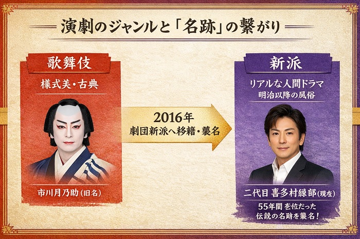 ここで、初心者が混乱しやすい「歌舞伎」と「新派」の違い、そして「名跡」の関係を整理しておきましょう。