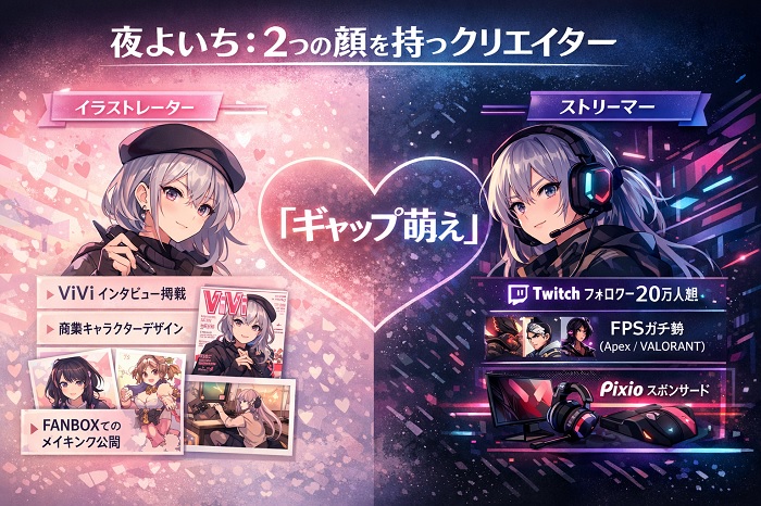夜よいちさんの凄さは、イラストレーターとストリーマー、どちらかが「副業」や「趣味」の域に留まっていない点にあります。
