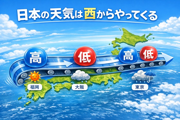 - 西から変わる理由: コンベアベルト(偏西風)が西から東へ流れているから、天気も必ず西(九州方面)から東(関東・東北方面)へと順番に変わっていく。