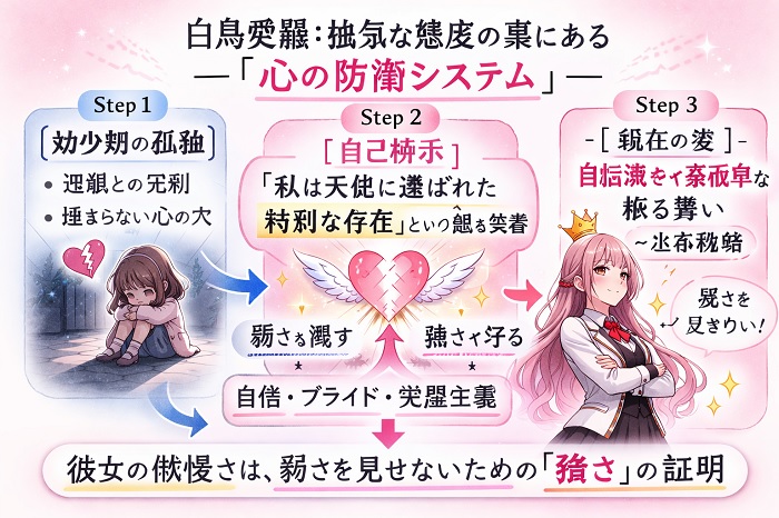 この「選ばれし者」という自己暗示は、白鳥愛羅が幼少期に経験した「母親との死別」という深い孤独から自分を守るために作り上げた、心の鎧(防衛本能)なのです。