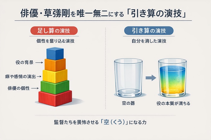 多くの俳優が役作りのために膨大な準備をし、それを「足し算」して現場に臨むのに対し、草彅剛は自分を「無(ニュートラル)」の状態に置くことで、役という魂が入り込むための「器」を完成させているのです。