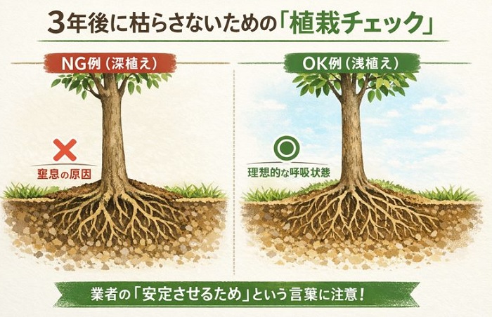 寿命を左右する「植え方」の真実。業者の『深植え』を見抜くチェックリスト